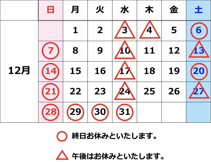 12月28日〜1月4日まで、年末年始のため休診といたします。